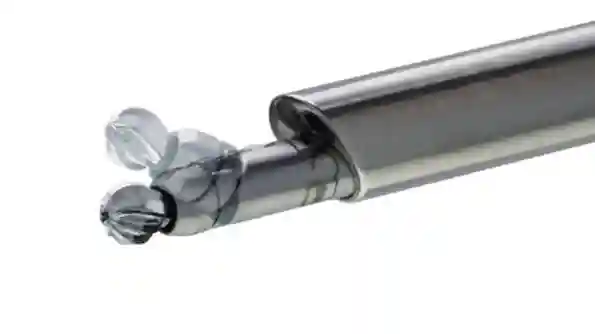 This disposable resector blade connects to the M5 handpiece, and a robust mechanism allows a lever at the handpiece end to actively deflect the distal tip. This allows the resector to reach much of the disc space, and much of the nucleus tissue can be readily removed. The oscillating mode of the M5 motor handpiece allows effective resection of stronger disk material, while the connected suction facilitates its evacuation.