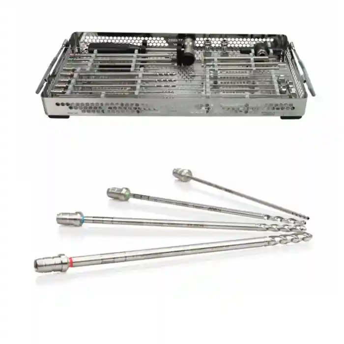 The multifunctional handle with an ergonomic grip ensures maximum control in the individual work steps and facilitates handling in a surgical intervention. An additional color marking for the instruments permits fast and unambiguous allocation of individual components that fit together.