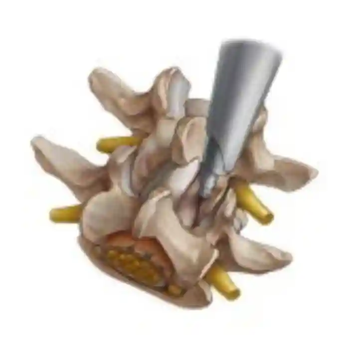 After the access has been created, the bony structures are exposed. It may be helpful to start decompression at the caudal end of the descending facet. Depending on the pathology, decompression is then commenced with resection of parts of the medial descending facet, the cranial and caudal lamina, and the ligamentum flavum. The extent of decompression generally continues cranially at least until the tip of the ascending facet and caudally to half of the pedicle. The medial portions of the ascending facet and the ligamentum flavum are then resected until sufficient decompression of the neural structures can be clearly seen - cranially, caudally and laterally. In the case of a central stenosis, the ligamentum flavum generally needs to be resected medially to the midline. Finally, it may be necessary to remove protruding annulus parts and osteophytes in the ventral epidural space.
